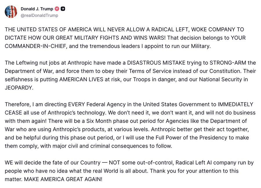 Le porte-parole du Pentagone, Sean Parnell, a affirmé que l’armée « n’a aucun intérêt à utiliser l’IA pour mener une surveillance de masse des Américains (ce qui est illégal) ni à utiliser l’IA pour développer des armes autonomes fonctionnant sans intervention humaine », mais a souligné : « Nous ne laisserons AUCUNE entreprise dicter les conditions de nos décisions opérationnelles. »