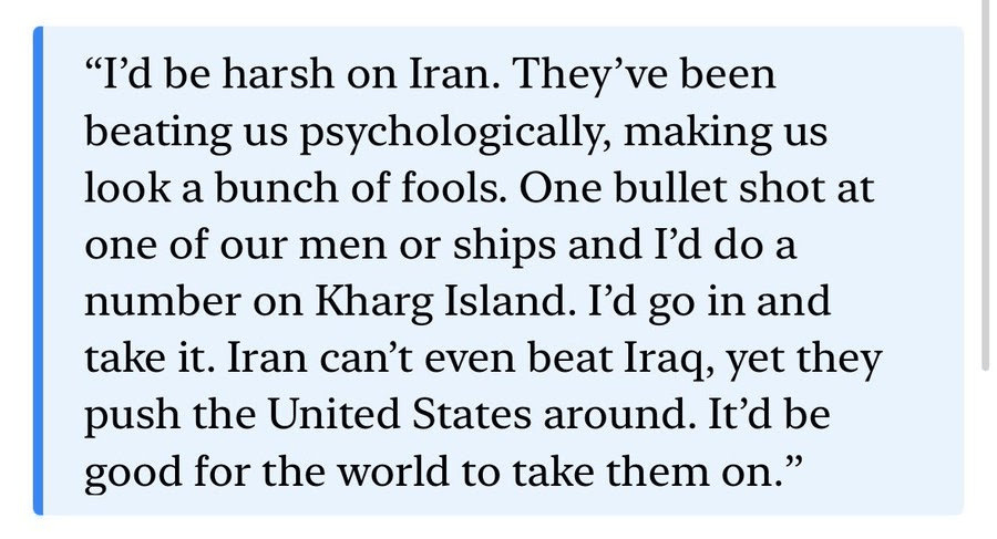 « Je serais dur avec l’Iran. Ils nous battent psychologiquement, ils nous font passer pour une bande d’idiots. Un seul projectile tiré sur l’un de nos hommes ou l’un de nos navires, et je ferais un carnage sur l’île de Kharg. J’irais là-bas et je la prendrais. L’Iran n’arrive même pas à battre l’Irak, et pourtant ils malmènent les États-Unis. Ce serait bon pour le monde de les affronter. »