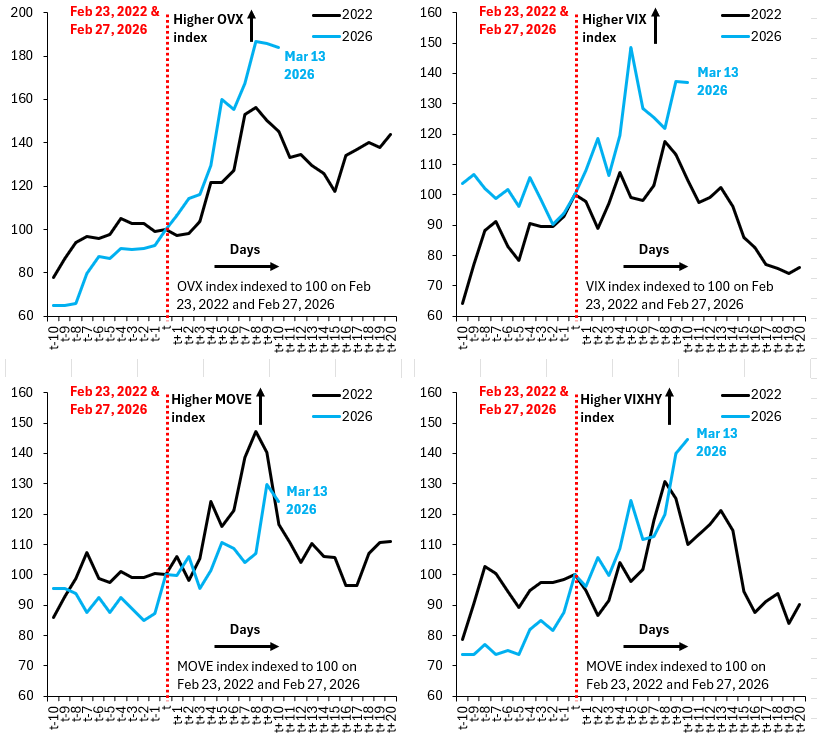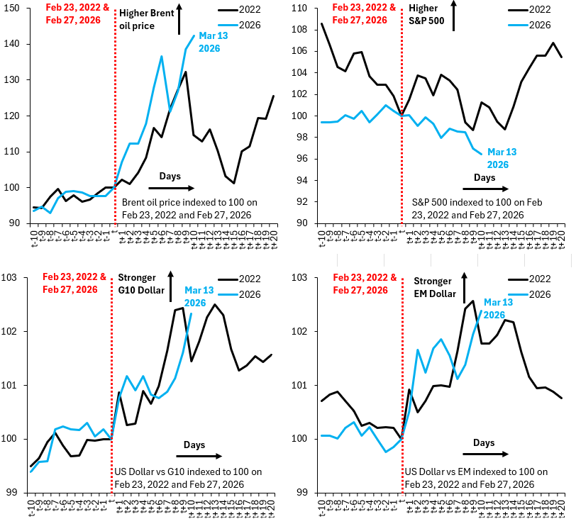 - Marchés au comptant : les quatre graphiques ci-dessous illustrent l’évolution du prix du pétrole Brent (en haut à gauche), du S&P 500 (en haut à droite), du dollar par rapport aux devises du G10 (en bas à gauche) et du dollar par rapport aux marchés émergents (en bas à droite). La courbe bleue représente la situation actuelle et la courbe noire, celle de 2022. Dans les deux cas, les indices ont été fixés à 100 la veille du début d’un conflit, soit le 23 février 2022 pour l’Ukraine et le 27 février 2026 pour l’Iran. La prime de risque du Brent est légèrement supérieure à son niveau de 2022 et le S&P 500 est légèrement plus faible. Le dollar, quant à lui, est parfaitement aligné sur son niveau de 2022. Globalement, étant donné que le détroit d’Ormuz est trois fois plus important que la Russie pour l’approvisionnement mondial en pétrole, les marchés se comportent de manière très stable.