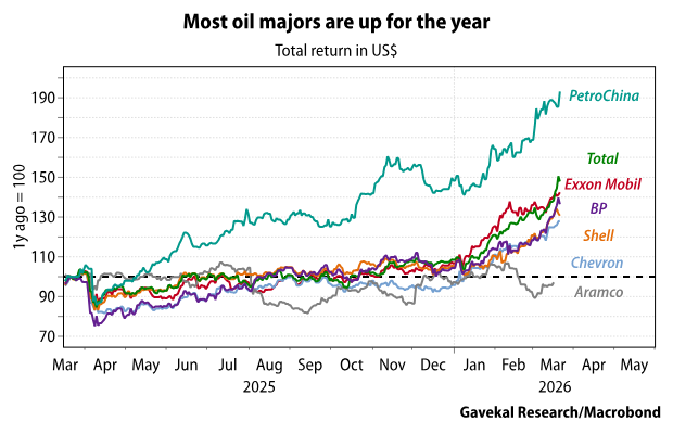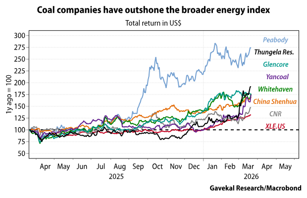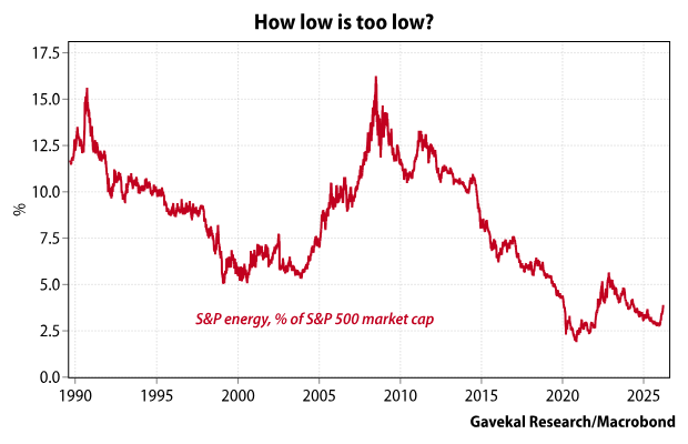 Je ne veux pas critiquer les investisseurs, mais ces deux dernières semaines ont une fois de plus démontré que le portefeuille équilibré est obsolète et que la véritable protection contre les risques liés aux actions ne réside plus dans les obligations, mais dans l’énergie . Il s’agit là d’un thème récurrent chez Gavekal (voir « Actions énergétiques : une simple couverture »), et plus l’incertitude politique mondiale persiste, plus cette affirmation se confirme. La fermeture du détroit d’Ormuz contraint désormais investisseurs, entreprises et pays entiers à se rendre à l’évidence et à revoir leurs allocations et politiques énergétiques. Compte tenu du niveau d’incertitude quant à l’évolution de la situation dans le golfe Persique, la tâche est loin d’être aisée.