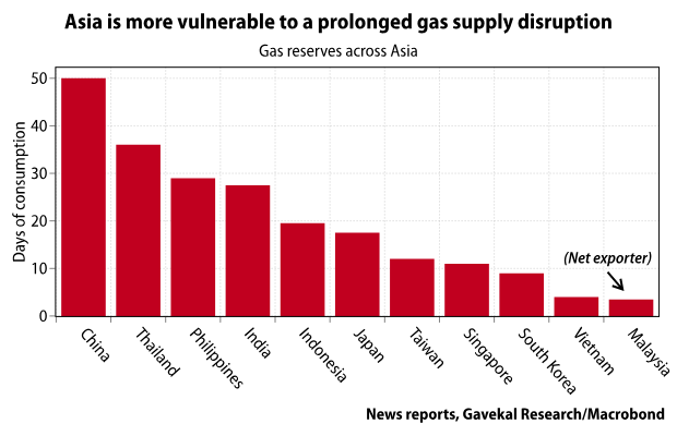 Comme l’illustre le graphique de la page 2, des pays comme la Corée, Taïwan et le Japon disposent désormais de moins de dix jours de réserves de gaz naturel. Sachant que la plupart de ces pays s’approvisionnent en grande partie en gaz auprès du Qatar, la situation est extrêmement problématique pour leurs dirigeants. Les coupures de courant sont un véritable suicide politique, surtout si, dans le même temps, l’électricité chinoise reste abondante et bon marché. En cas de pénurie d’électricité, les électeurs taïwanais, par exemple, se tourneraient vers leurs responsables politiques et diraient : « Pendant que nous accumulions des bons du Trésor américain, des armes américaines et des lingots d’or, la Chine faisait des réserves de pétrole, de gaz naturel et de charbon. Et maintenant, ils ont de l’électricité et pas nous. Vous êtes incompétents. Vous êtes virés ! »