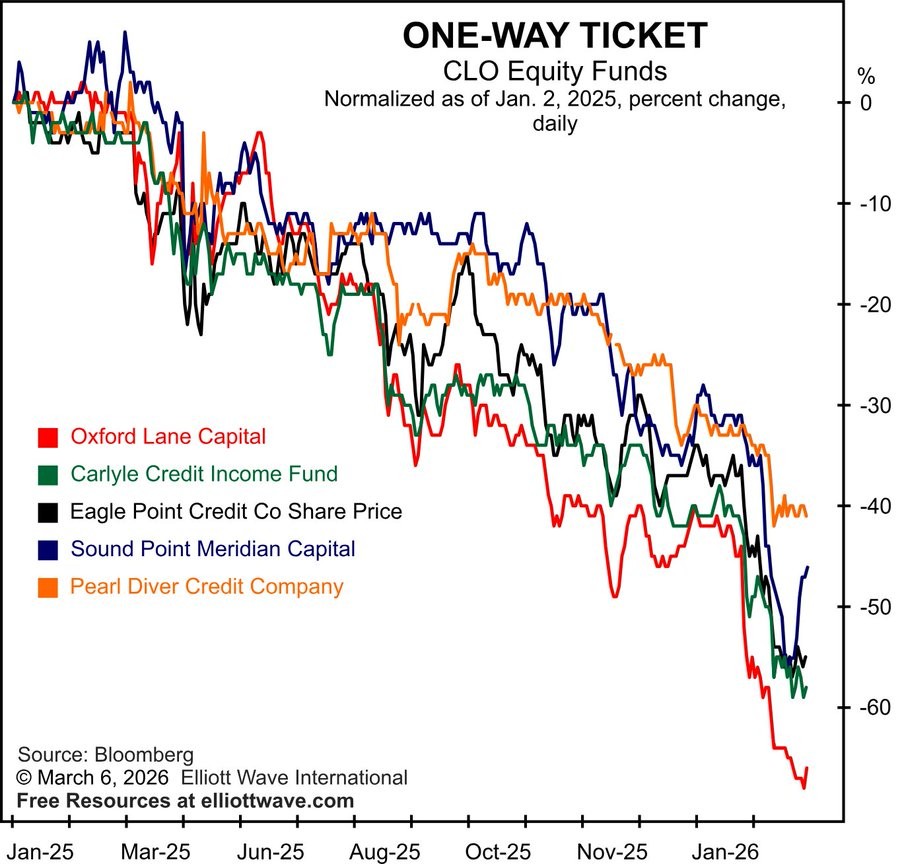 Le graphique publié par Elliott Wave (intitulé « ONE-WAY TICKET ») illustre cette dégringolade : cinq grands fonds CLO ont tous perdu entre 40 % et plus de 60 % en un an, sans rebond significatif.