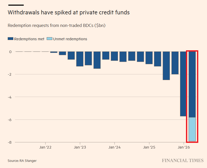 Les demandes de rachat des fonds de crédit privé non cotés ont bondi à plus de -7,5 milliards de dollars au premier trimestre 2026, une part importante restant insatisfaite en raison des limites de retrait imposées par les fonds.
