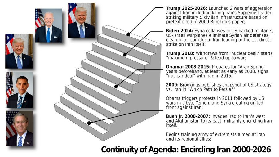 La guerre des États-Unis contre l’Iran est un programme bipartisan continu mis en œuvre à travers de multiples présidences américaines – républicaines ou démocrates – motivé par les intérêts des entreprises-financiers qui bénéficient le plus de la primauté américaine dans le monde, y compris l’industrie des armements et le grand pétrole.