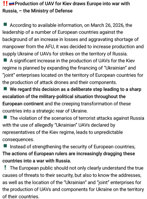 La déclaration du ministère russe de la Défense doit être prise au pied de la lettre : la liste des installations européennes fabriquant des drones et autres équipements constitue une liste de cibles potentielles pour les forces armées russes. La date à laquelle des frappes deviendront réalité dépendra des événements à venir. Dormez bien, partenaires européens !