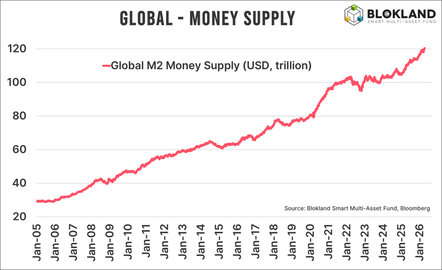 Ce graphique du fonds Blokland Smart Multi-Asset montre l’évolution de la Global M2 Money Supply (en trillions de USD) de janvier 2005 à janvier 2026. On passe d’environ 30 trillions à plus de 120 trillions de dollars, soit une multiplication par 4 en 21 ans.