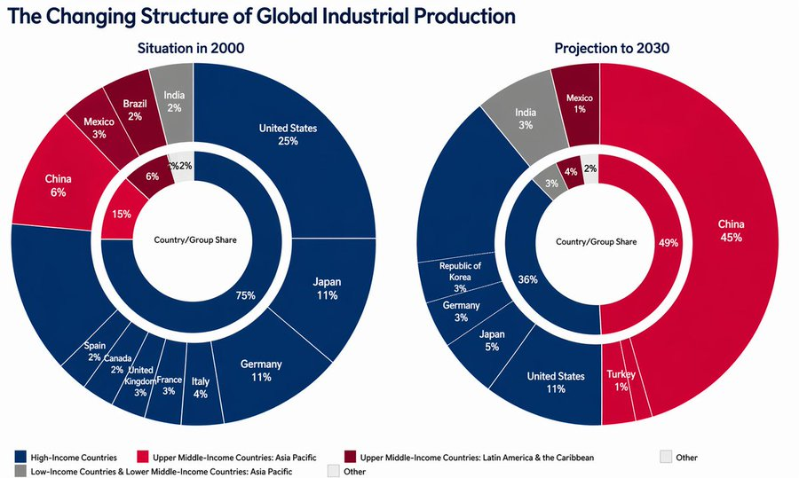 D’ici 2030, cet équilibre est projeté pour se déplacer de manière spectaculaire, avec l’Asie grimpant à environ 50 %, dépassant les économies à haut revenu dont la part chute à environ 35–40 %, marquant une relocalisation claire du pouvoir industriel.