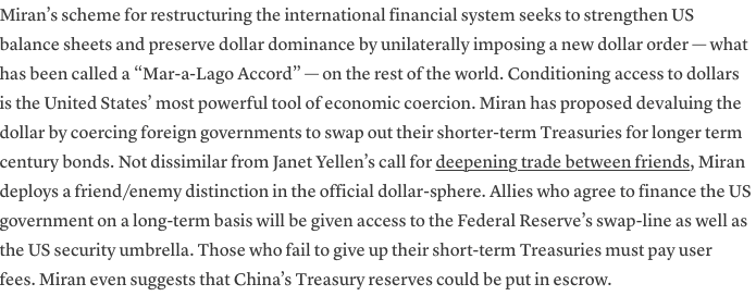Le deuxième évoque le « schéma de Miran » (référence à un conseiller économique) qui propose de restructurer l’ordre financier international en imposant un « Mar-a-Lago Accord » : les alliés qui financent la dette américaine à long terme (en échangeant des bons du Trésor à court terme contre des obligations à très longue échéance) obtiennent un accès privilégié aux swap lines et au parapluie de sécurité américain ; les autres paient des « frais d’utilisateur ».