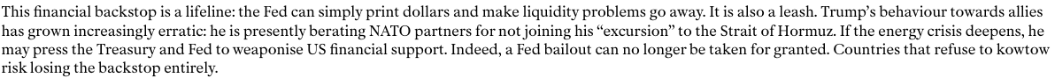 Les swap lines s’inscrivent dans cette logique : elles deviennent un outil de « statecraft financier » pour obliger les partenaires à financer le déficit américain dans des conditions favorables aux États-Unis, tout en punissant les récalcitrants.