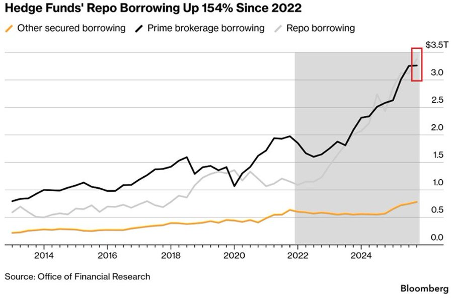 Ces niveaux représentent une explosion du levier : le repo a plus que triplé depuis 2019 et les emprunts prime brokerage ont doublé depuis 2022.