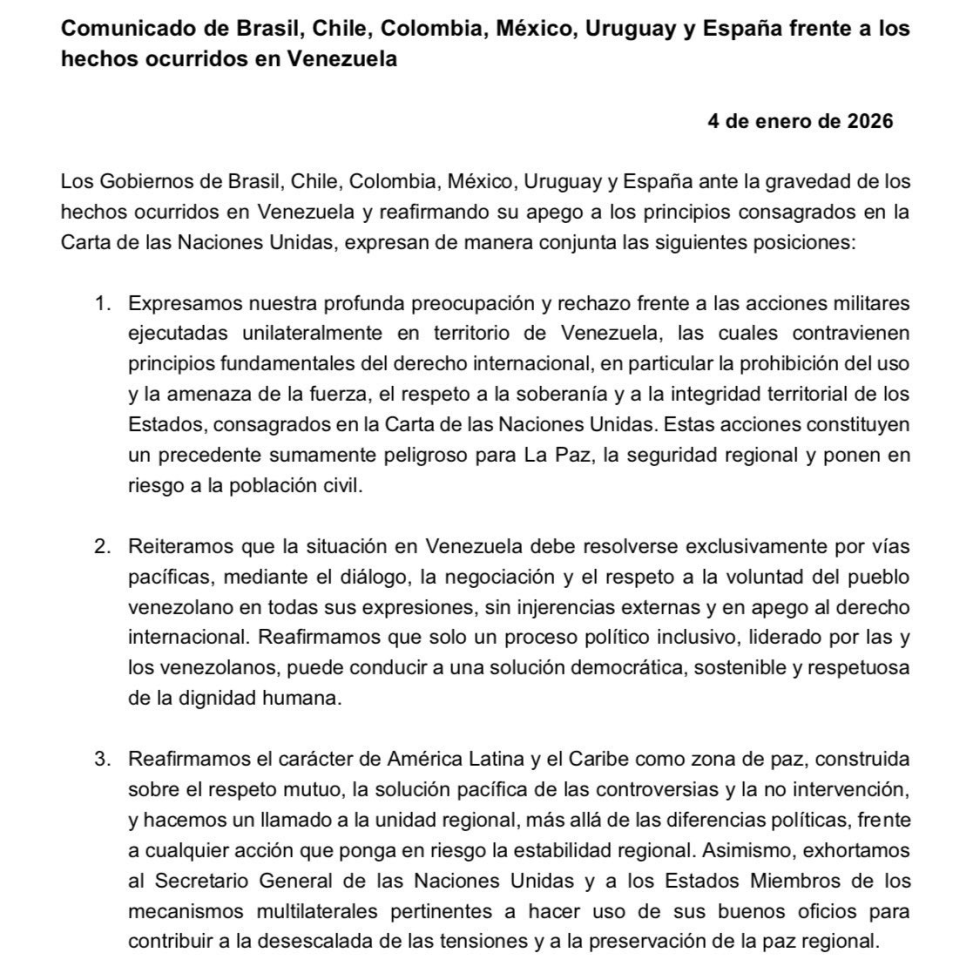 DOCUMENT. Traduction en français du communiqué de presse conjoint du Brésil, du Chili, de la Colombie, du Mexique, de l’Uruguay et de l’Espagne face aux événements survenus au Venezuela